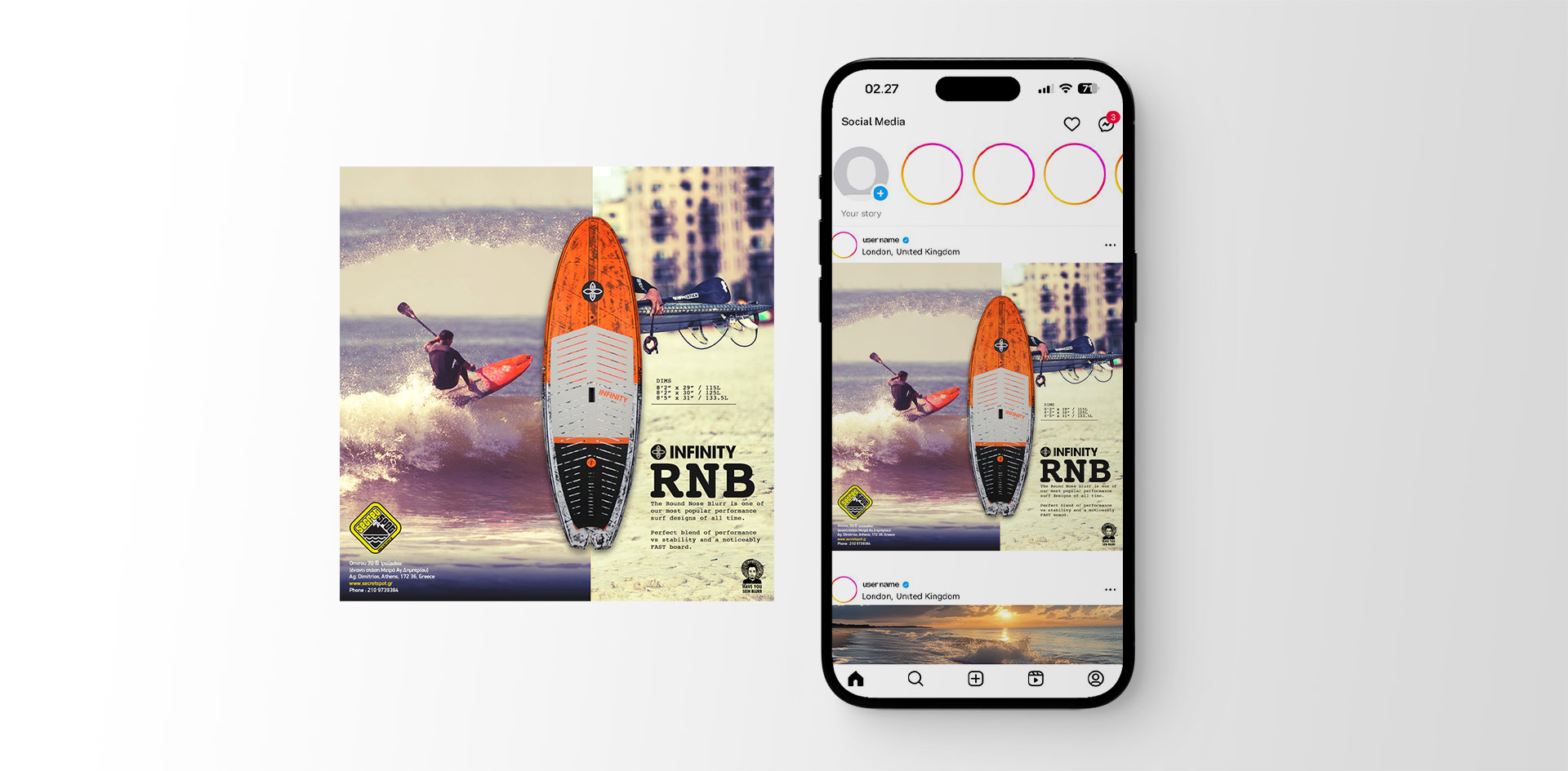 This social media post promotes the Infinity RNB (Round Nose Blur), a high-performance SUP surfboard. The board is described as a perfect balance between stability and speed, making it one of the brand’s most popular designs. The image highlights the board’s sleek shape and dynamic performance, with dimensions catering to different user preferences. The post encourages action with the brand’s contact information, inviting water sports enthusiasts to explore the board’s capabilities for a fast and exciting experience on the water.